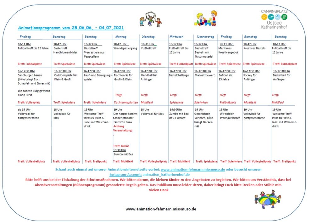 Alle Angebote finden unter den gültigen Hygienevorgaben statt. Bitte beachtet hierzu die Angaben auf den Animationsplänen.