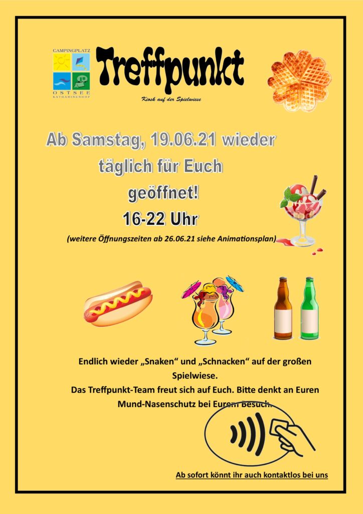 Ab dem 19.06.2021 ist der Treffpunkt wieder täglich für Euch geöffnet! Der Treffpunkt hat immer von 16 bis 22 Uhr auf. Weitere Öffnungszeiten findet ihr in Kürze hier oder auf unseren Animationsplänen.